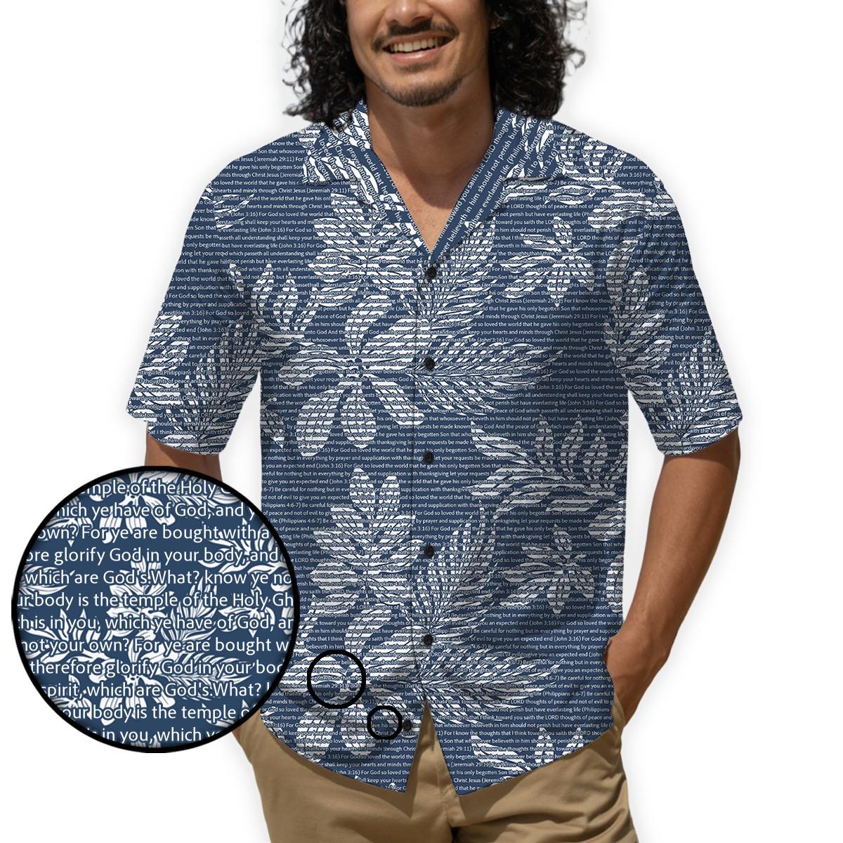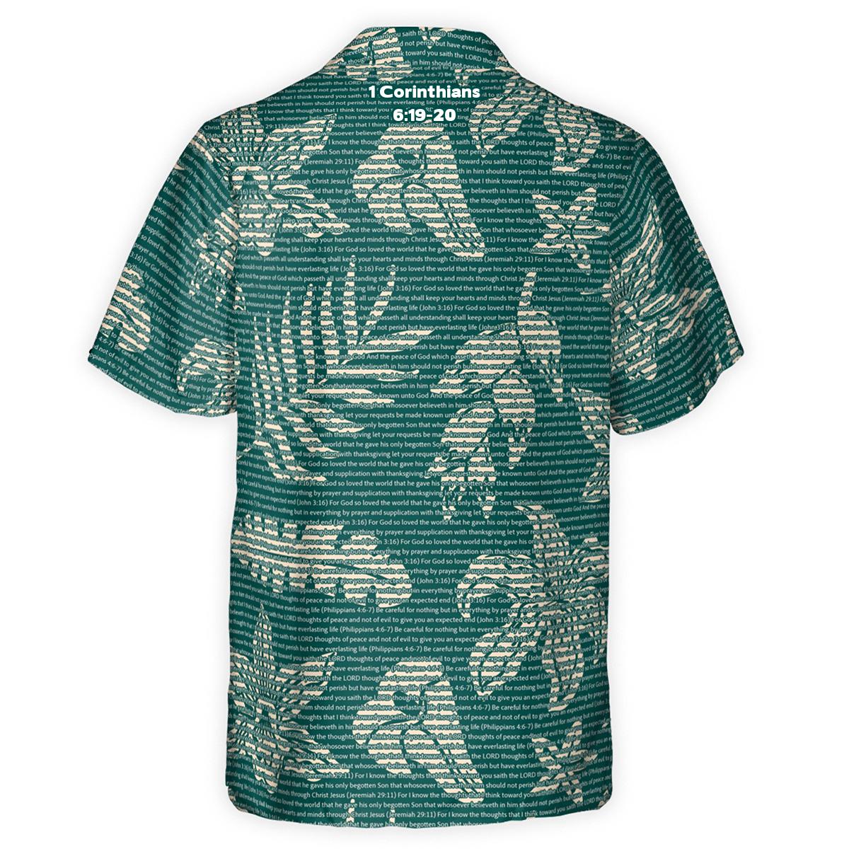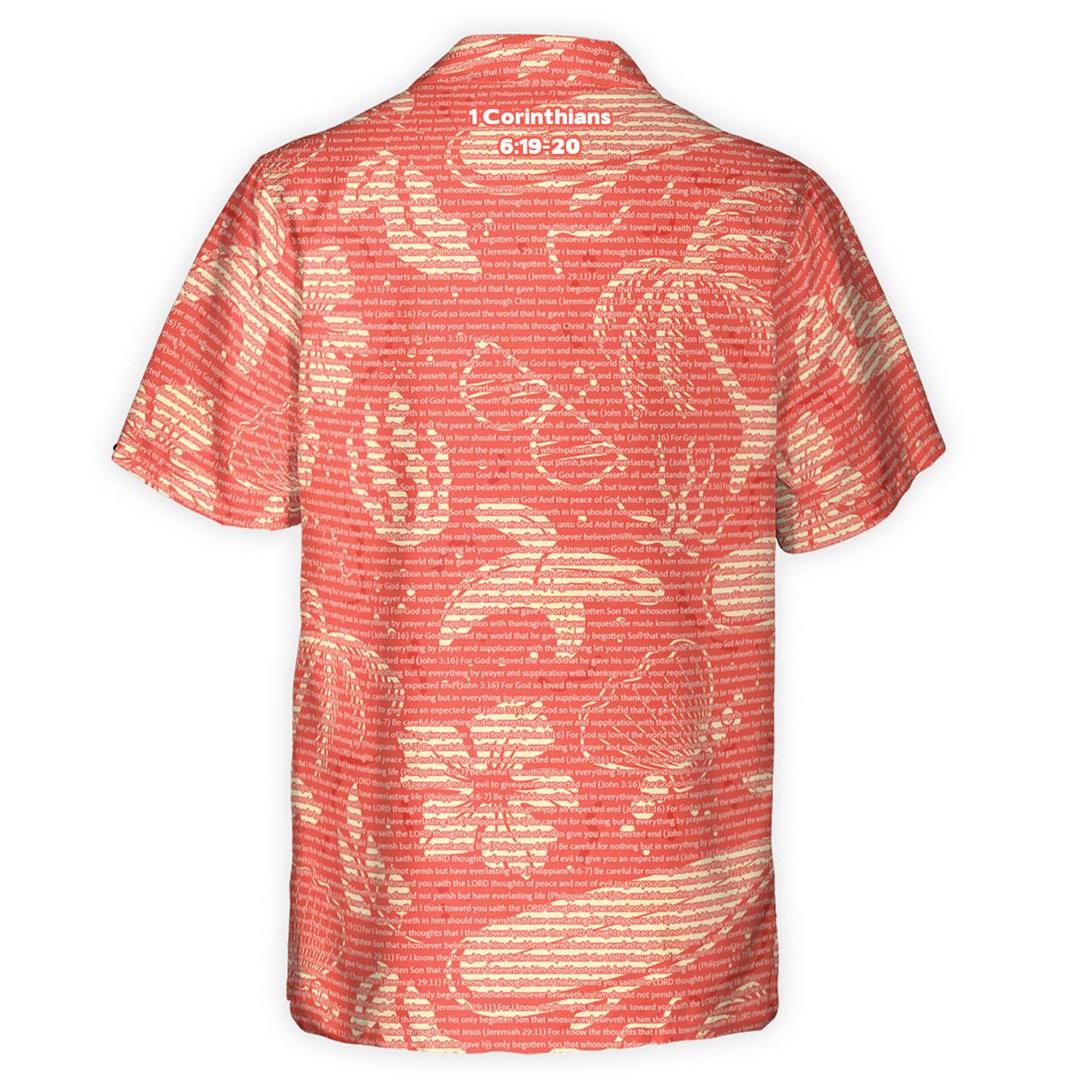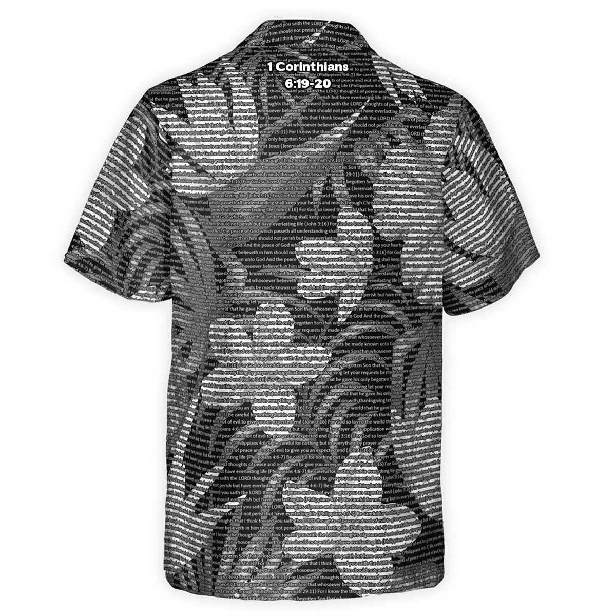 Wear your faith in island style with our cotton Hawaiian shirt featuring 1 Corinthians 6:19-20. This soft, breathable shirt brings one of scripture's most powerful promises to life - that nothing can separate us from God's love. Perfect for church, beach, or everyday wear. Faith meets aloha in every comfortable thread.