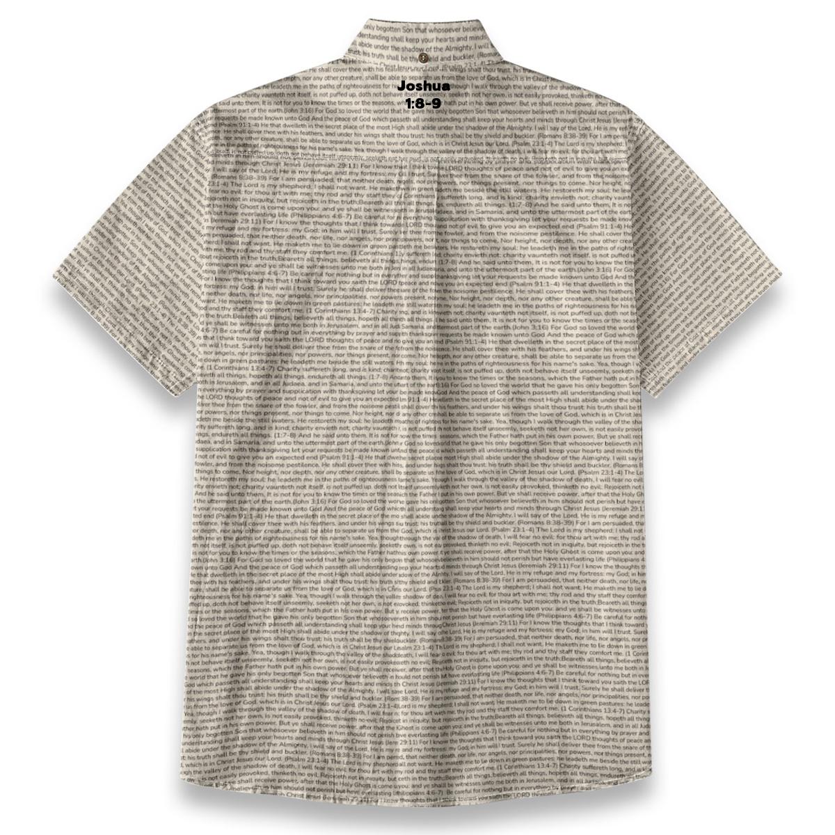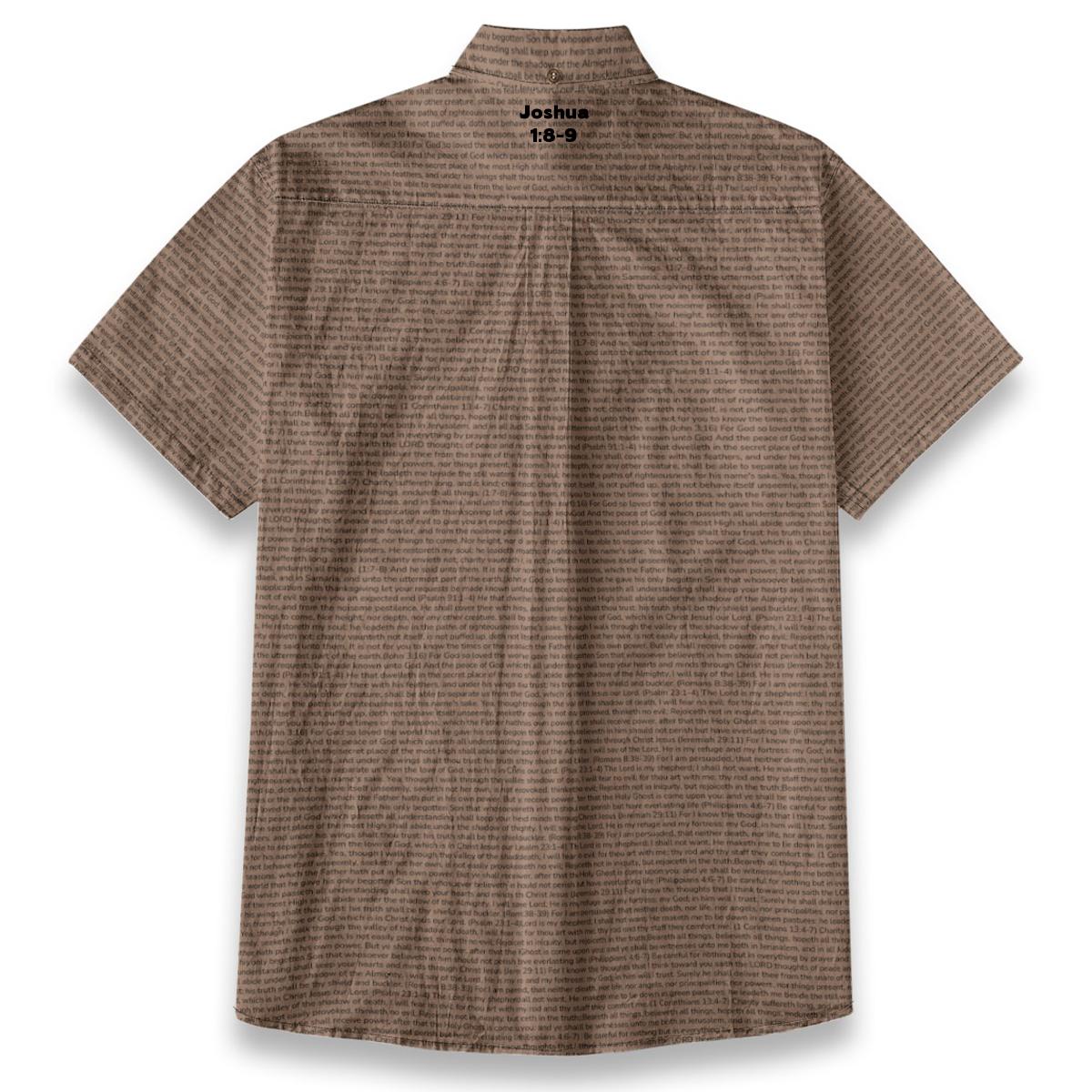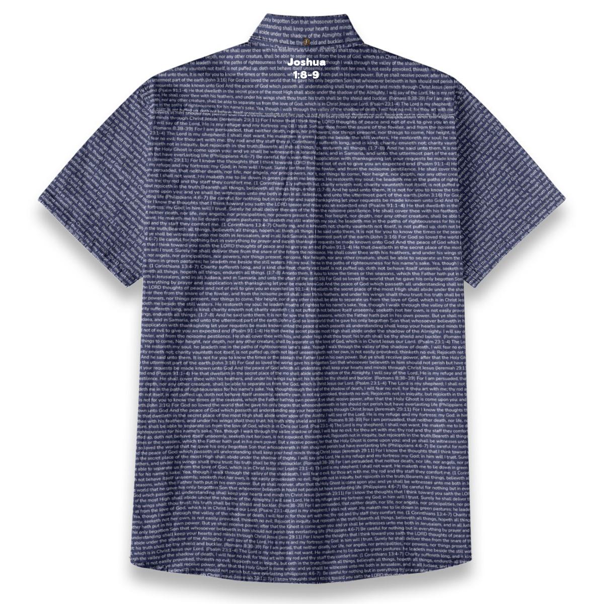 Breathable slub cotton shirt featuring Joshua 1:8-9 on a distinctive linen-look textured finish. The short sleeves and refined details make it perfect for church services, Bible study, or everyday witnessing.