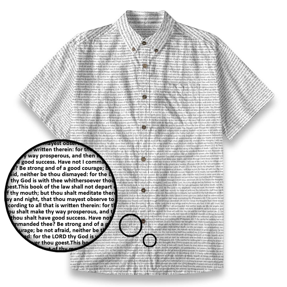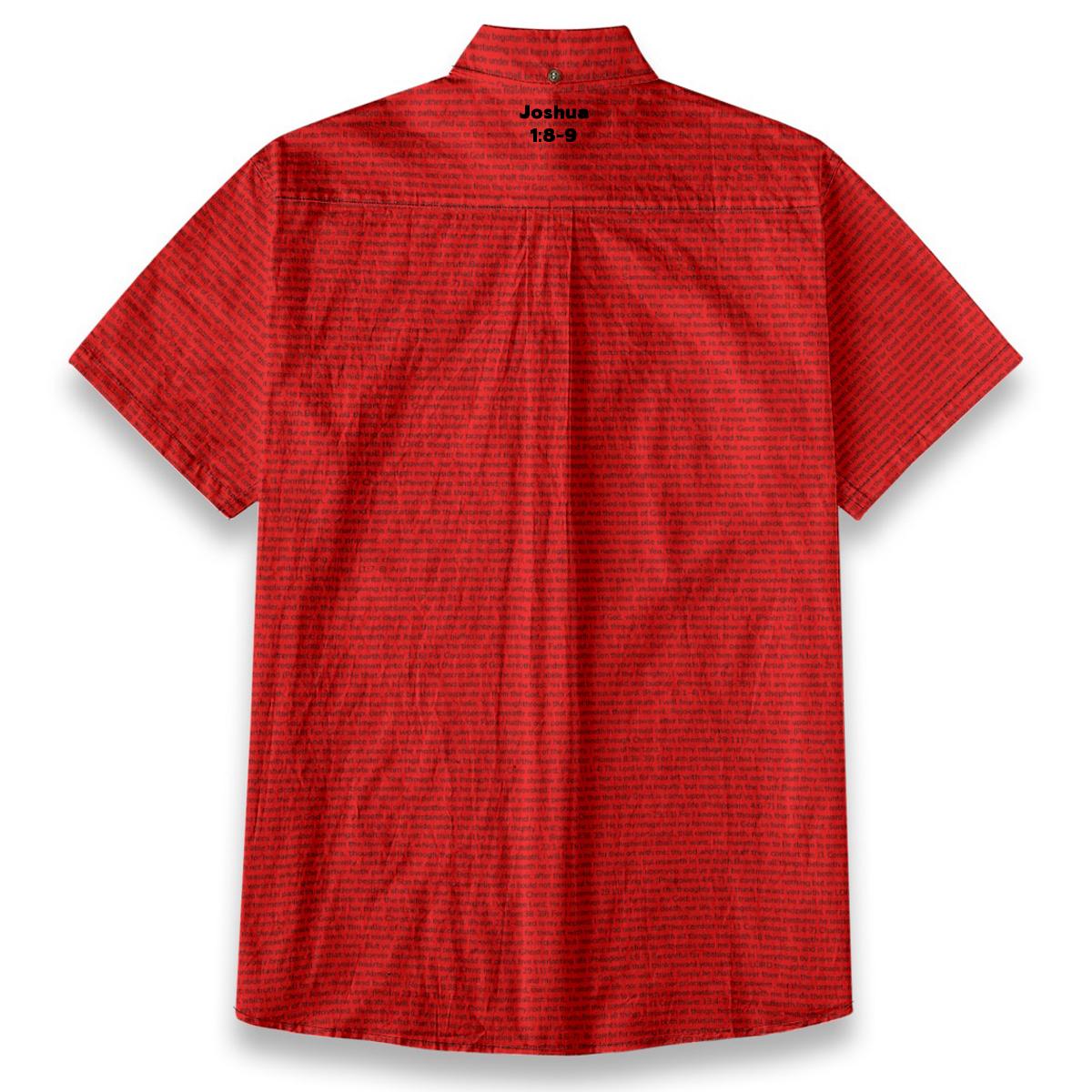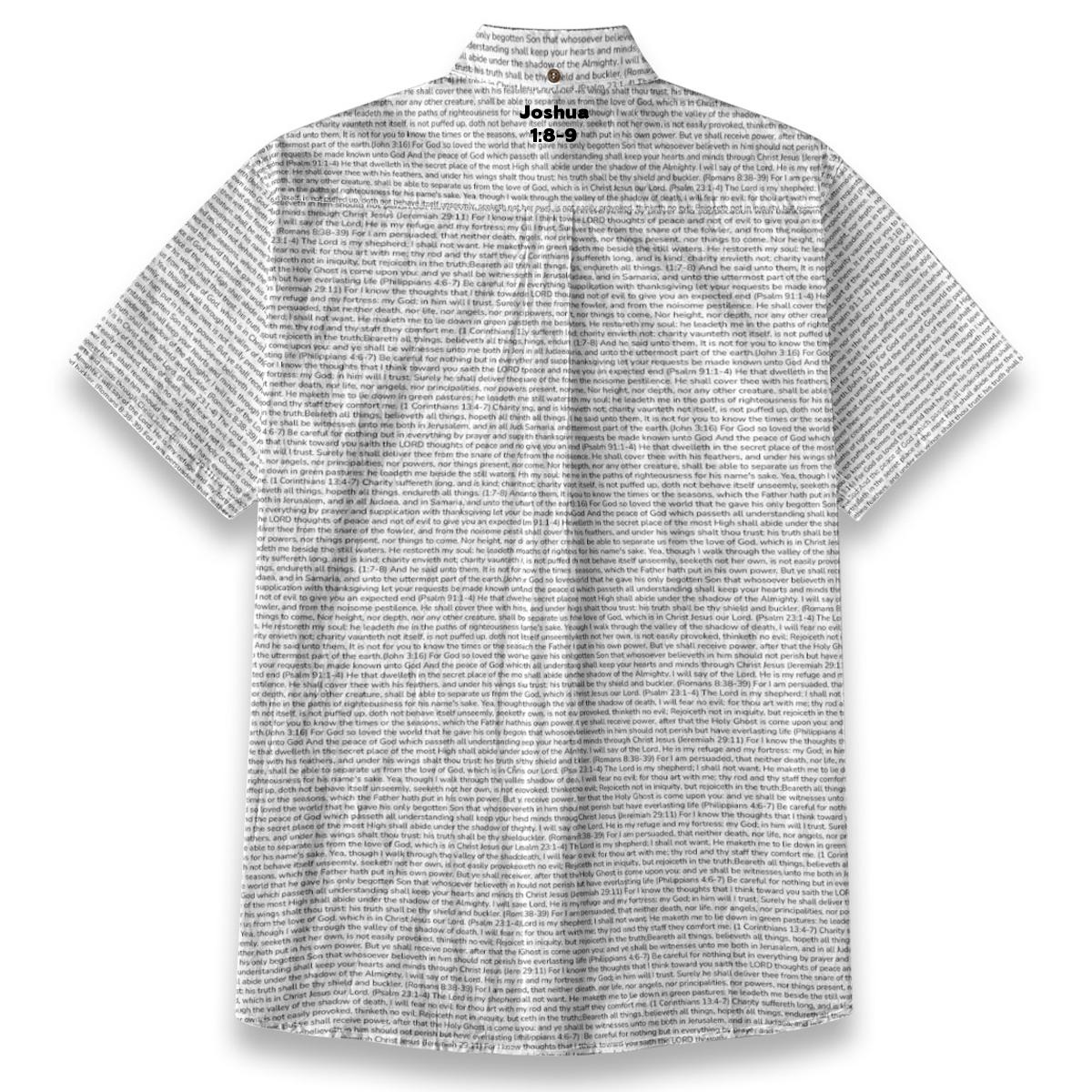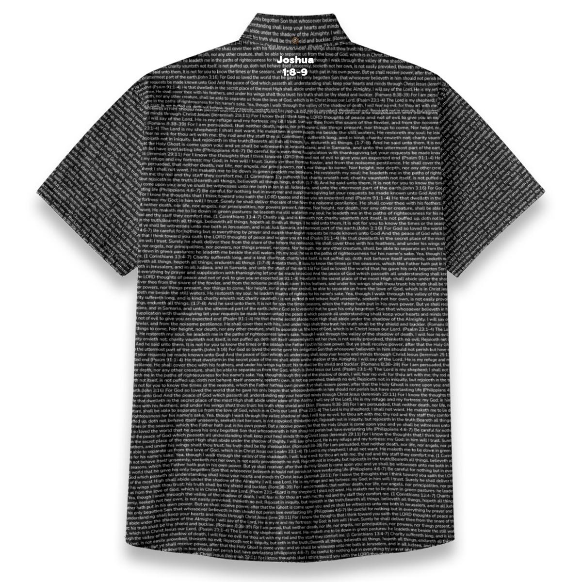 Breathable slub cotton shirt featuring Joshua 1:8-9 on a distinctive linen-look textured finish. The short sleeves and refined details make it perfect for church services, Bible study, or everyday witnessing.