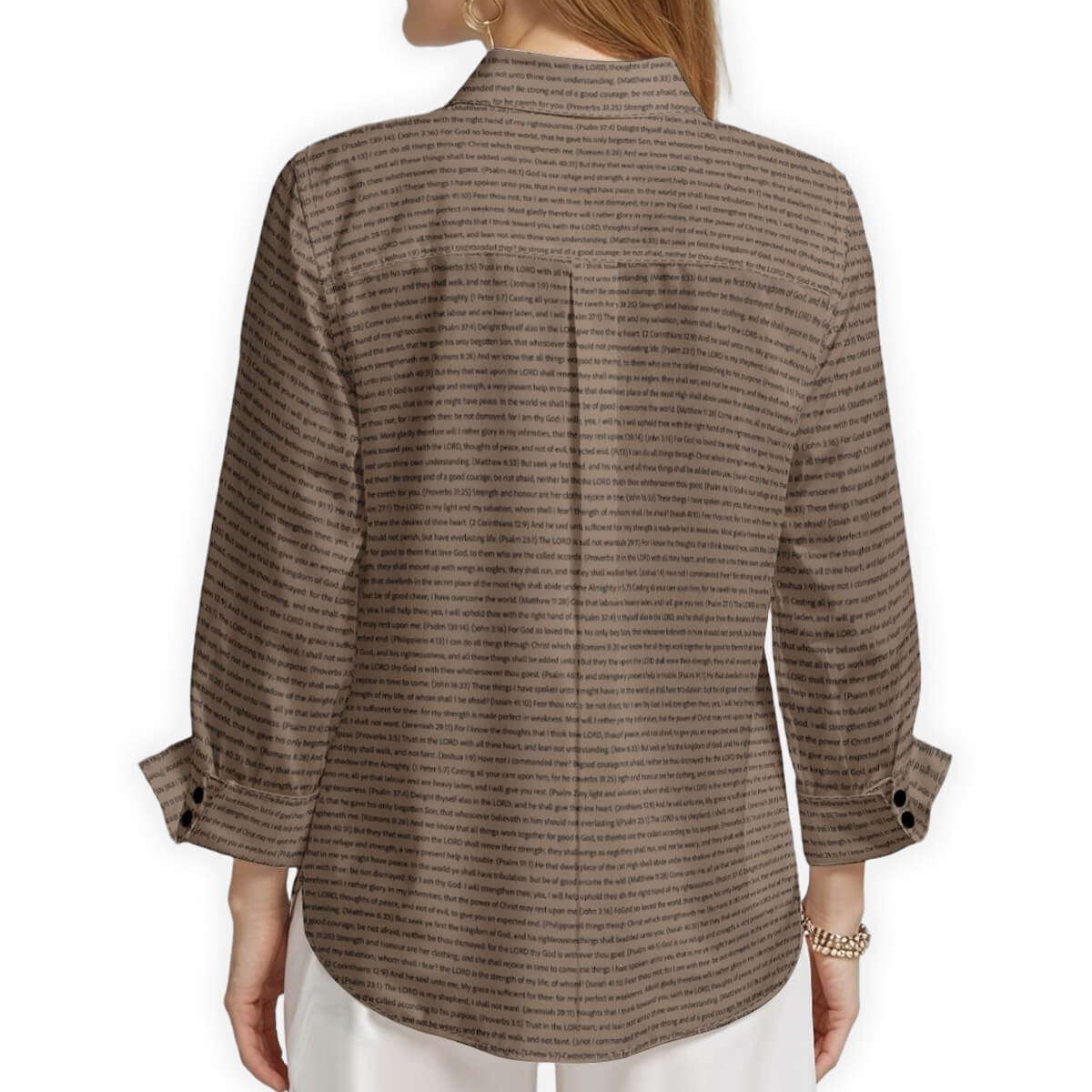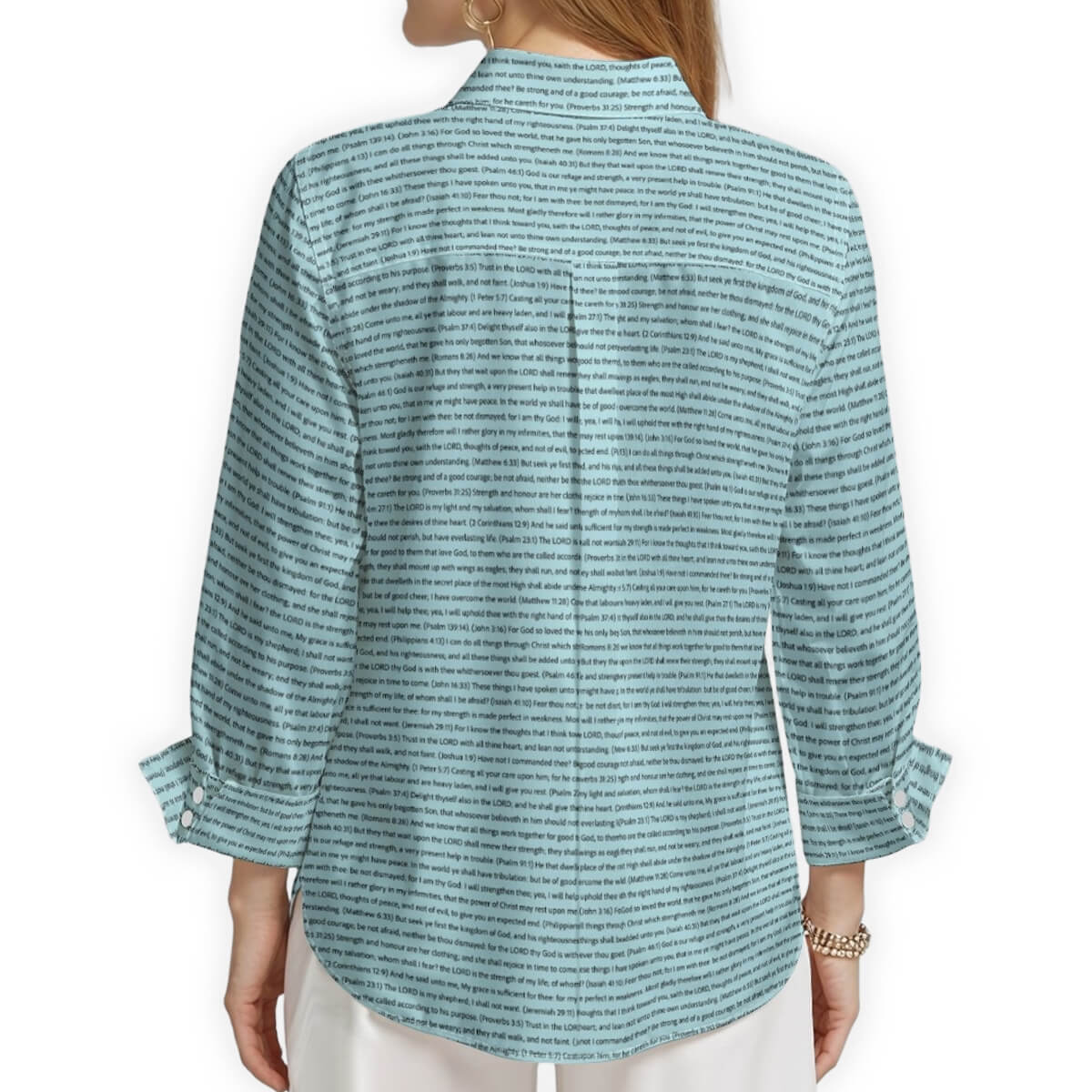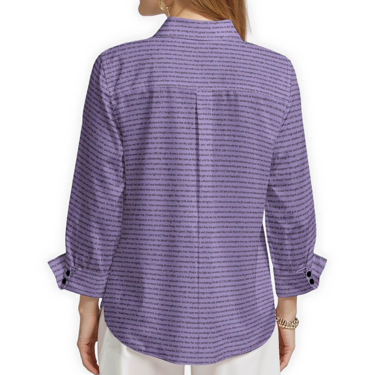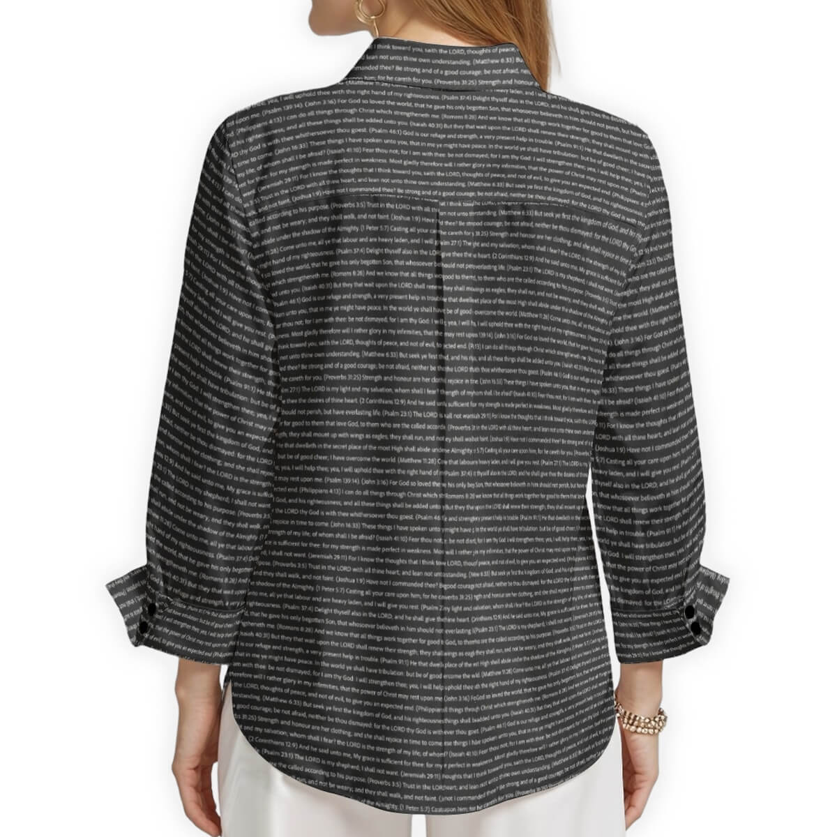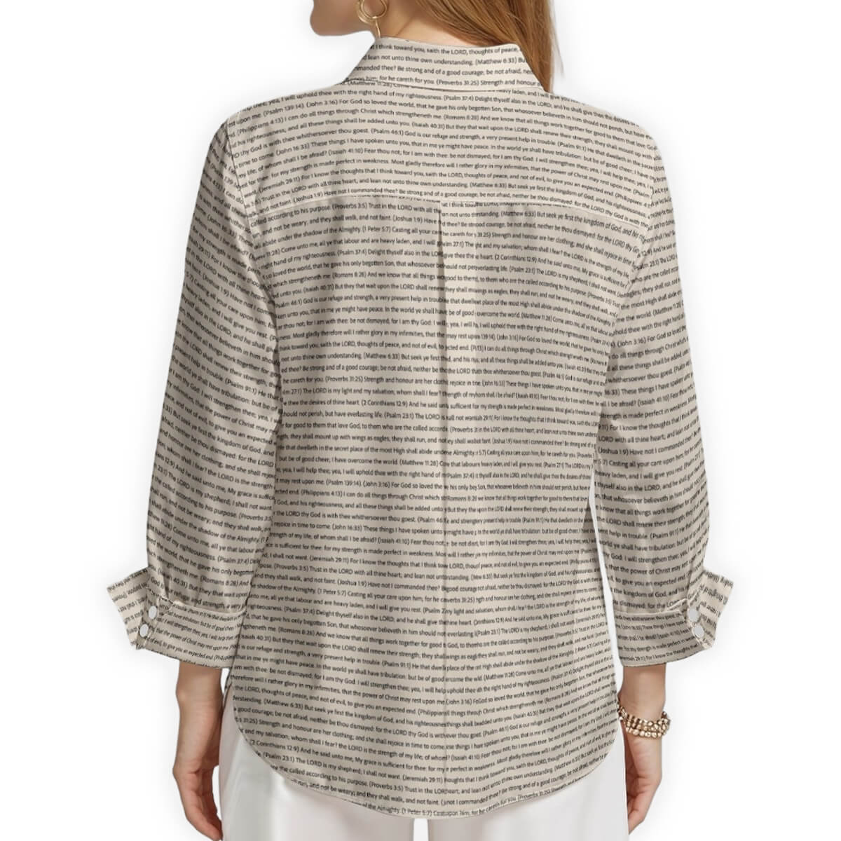 We exclusively use scripture texts directly from the King James Version (KJV) of the Bible. Every verse is carefully reproduced in its complete and original form, ensuring you're sharing the true Word of God through your apparel. Our commitment to biblical accuracy means each passage appears exactly as written in the KJV scripture, allowing you to wear and share these powerful verses in your daily life.